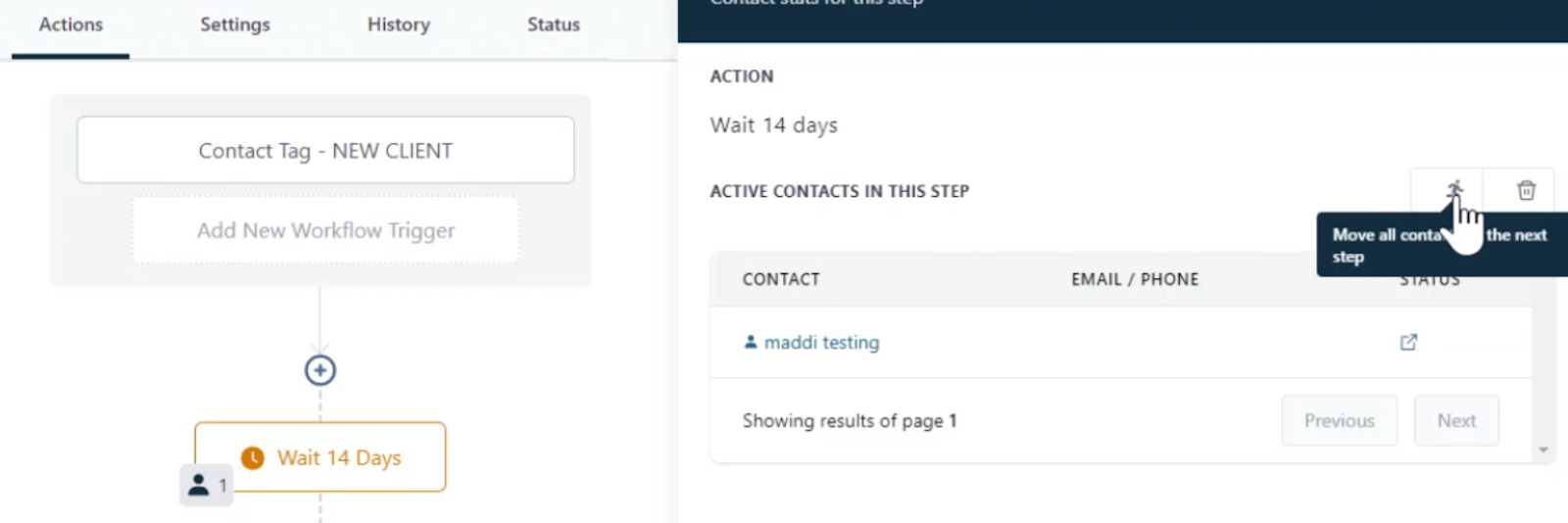 You now need to push all people currently in this original wait step to the new wait step. To do this, click on the person icon and then on the running man icon and click ‘move all’. This will then move all of those people at the existing wait step, to the next step in the workflow, which is now our new wait step we just created