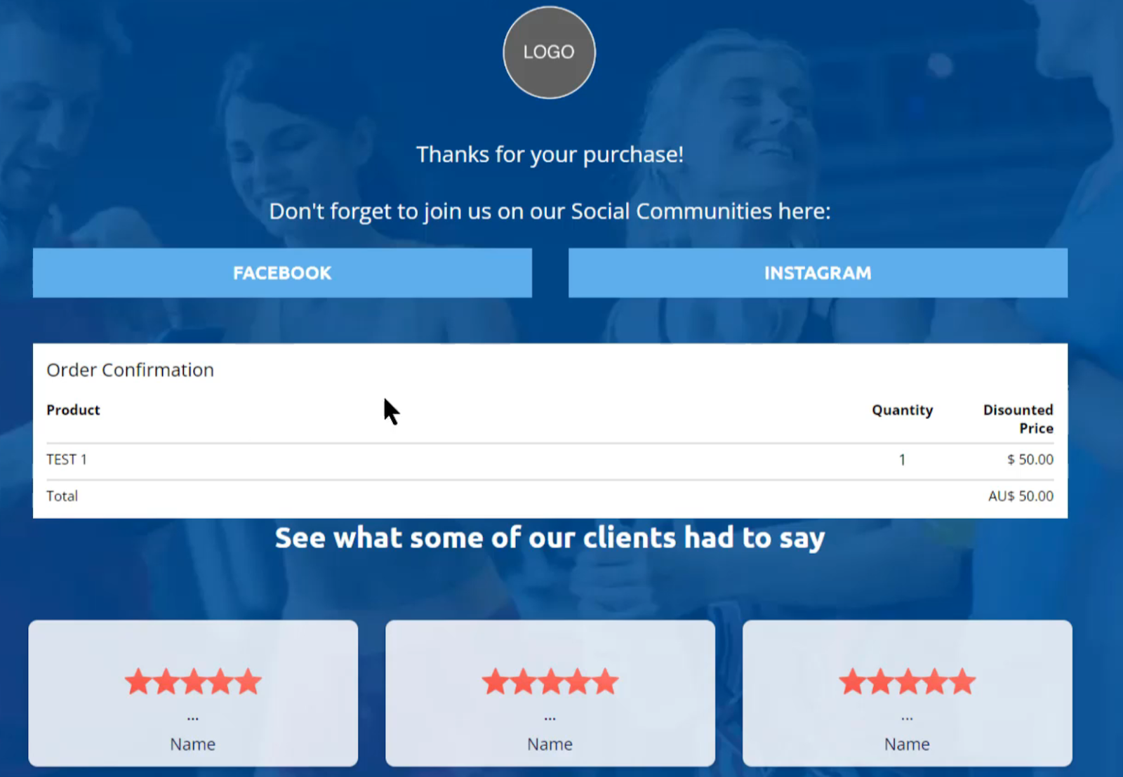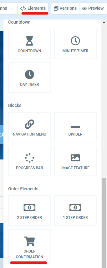 This confirmation page is fairly simple. This will thank them for their purchase and generally direct them to your social media pages as well and showcasing some testimonials. Importantly on this page, you also want to include the order confirmation. To add an order confirmation form element click Elements > Add Element. Scroll down until you see your Order Elements at the very bottom and drag and drop this element into your page