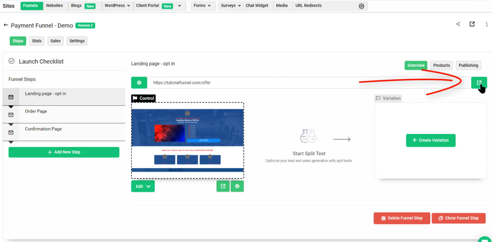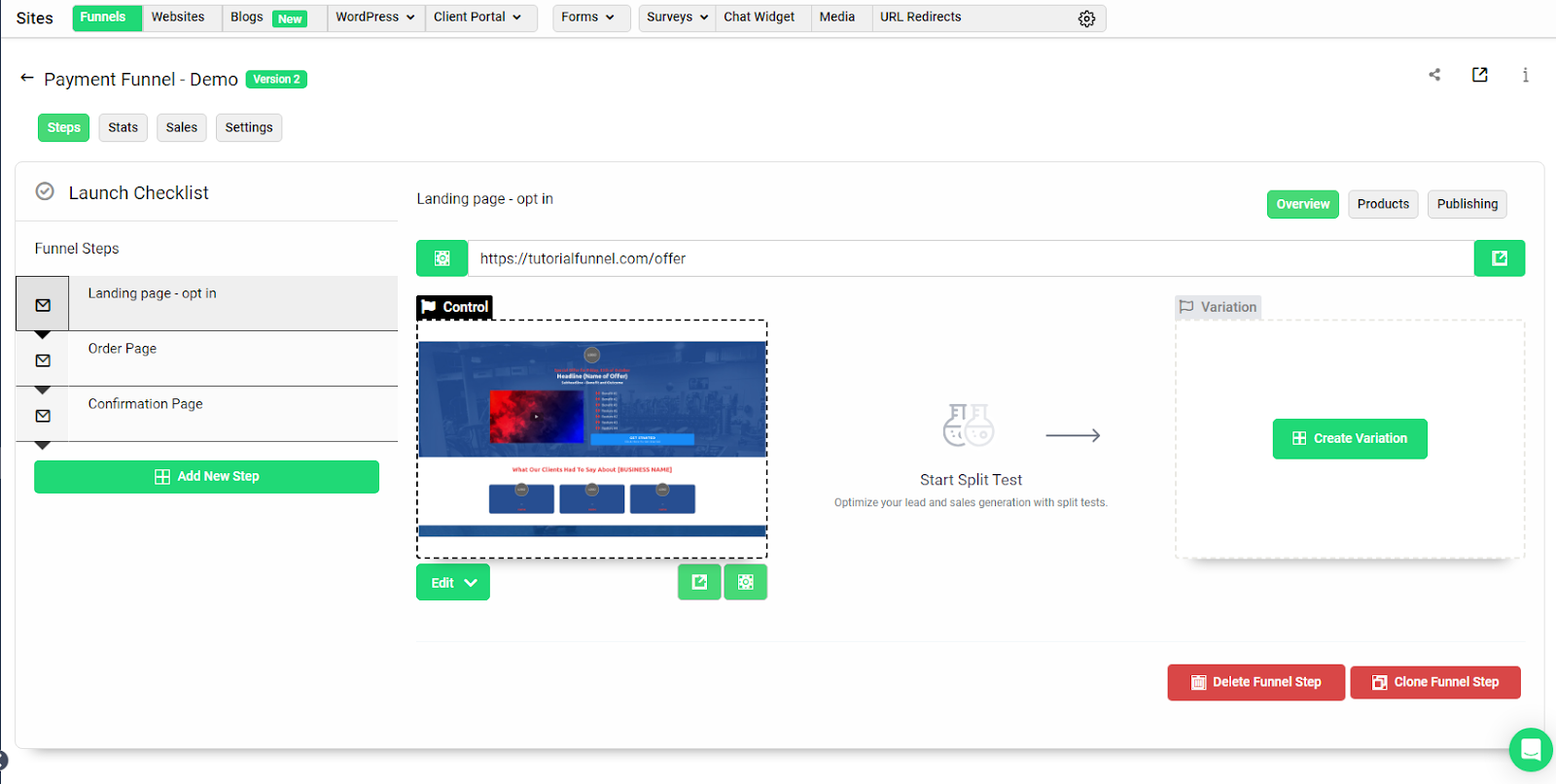 Navigate to ‘Sites’ within your account. Here is where you can create your payment funnel. If you would like this to look similar to an existing funnel you have, you have the option to clone that funnel and edit it, or you can create a new funnel from scratch. To learn how you can do this you can watch our Funnel Builder Overview video and our The Funnel Page Editor video.