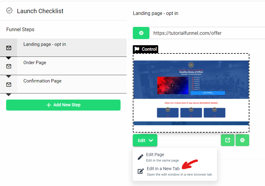 Click onto your landing page and select ‘Edit’ > ‘Edit in a New Tab’. this will open up a new tab for you edit your funnel