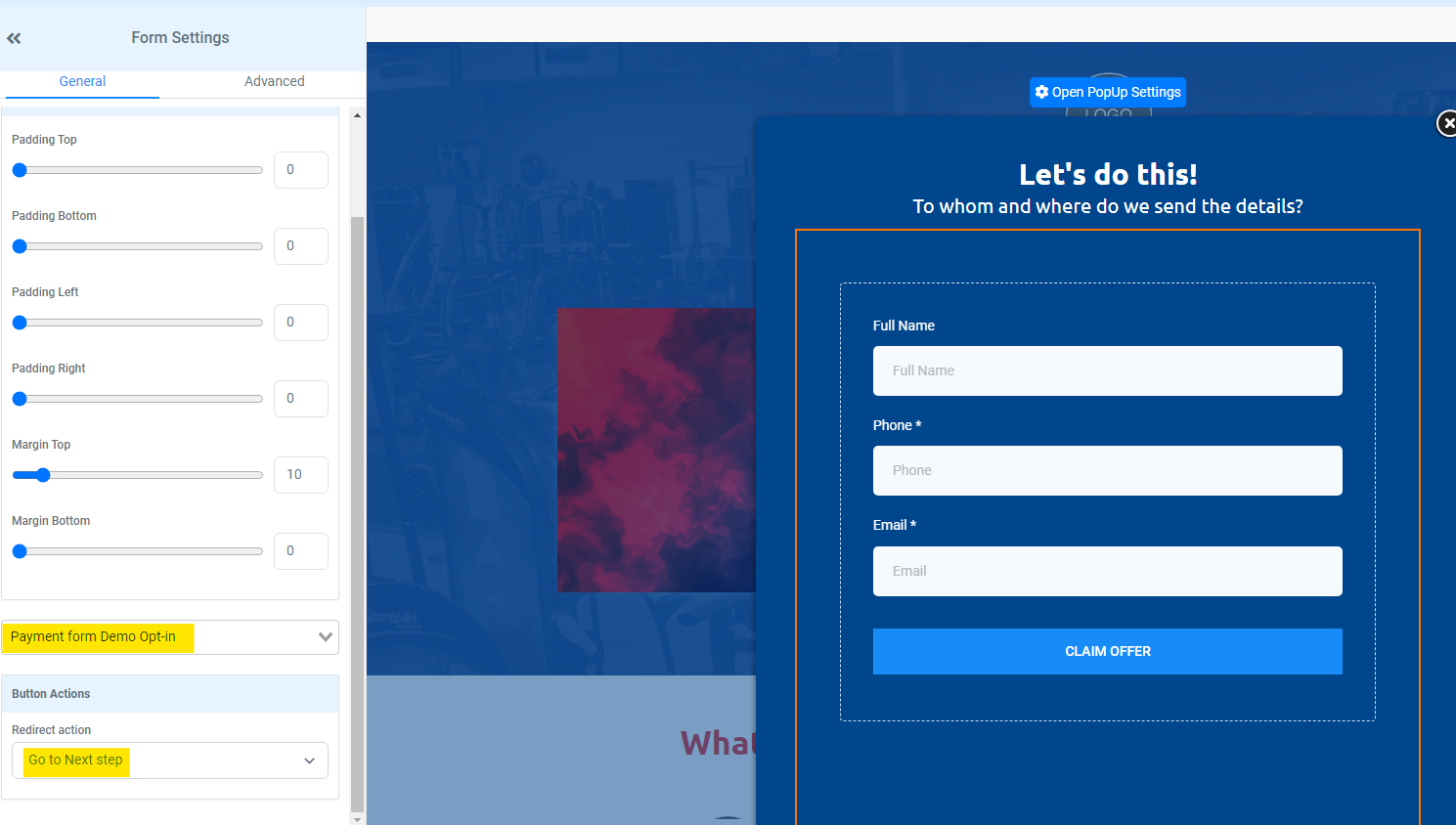 Select the form in the pop up and ensure the form that is selected is your payment opt in form you created earlier and your redirect action is set to ‘Go to Next step’ which will then redirect them to the next stage in your funnel when they submit this form