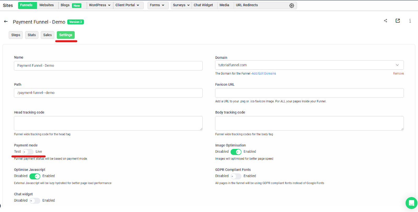 Now the funnel has been created, it is important to test it to ensure it is all working correctly. Firstly, you want to ensure you have your payment mode set to testing in the funnel settings. This will ensure you see the transaction on your stripe account as a test.
