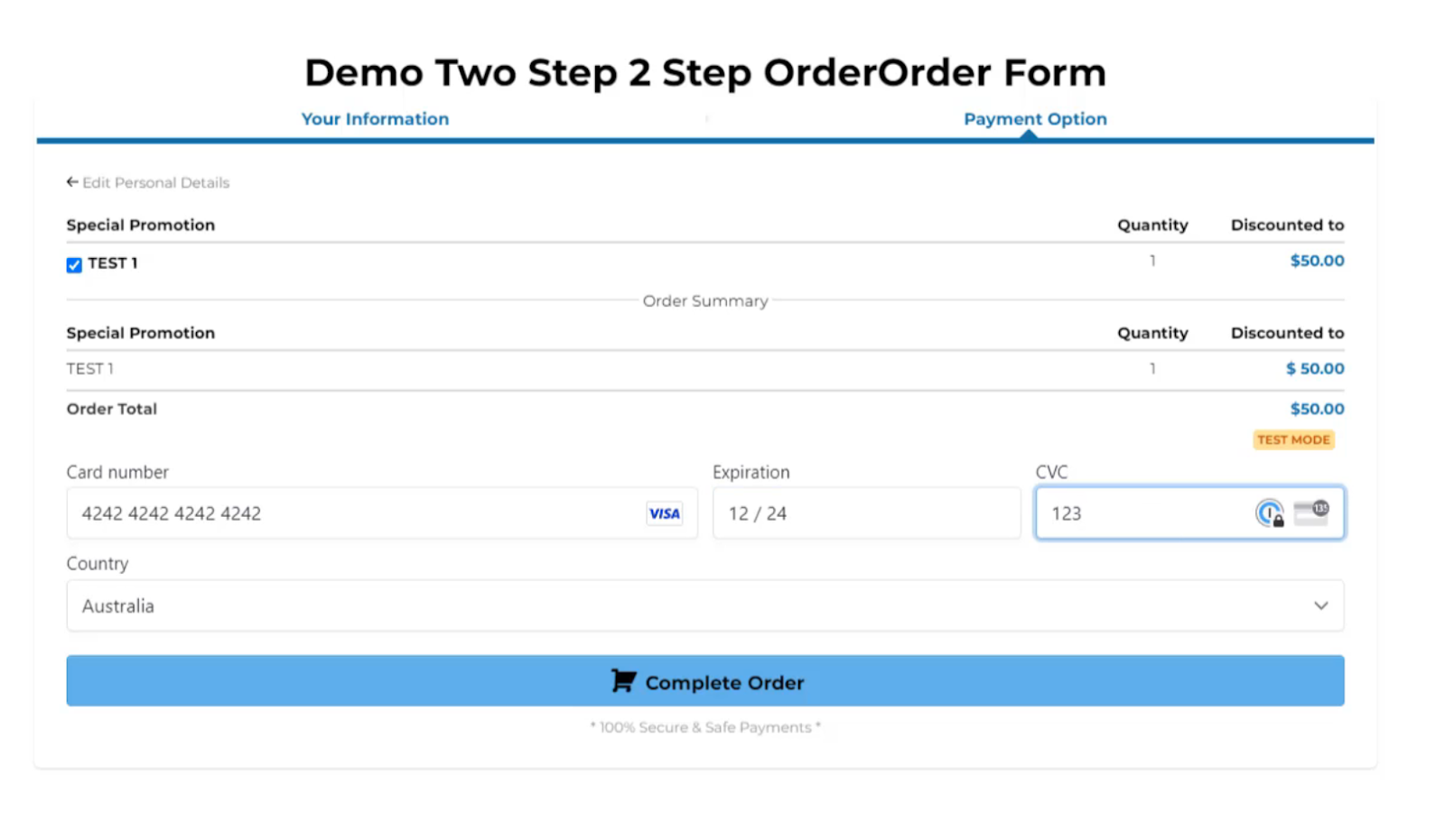 This is where the credit card information is to be filled out. Check all information on this page is correct. As you are testing the account, you can use the Stripe testing details which will create a successful transaction. The details for this test card are 4242 4242 4242 4242, the expiry date can be any month/year in the future and the CVC can be any three digits. Once this is done, click ‘Complete Order’