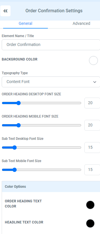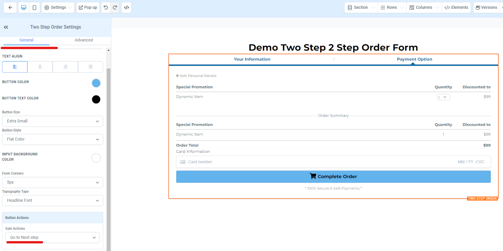 Once you have selected your order form, you then have the option to customise this form. On the left hand side under ‘General’ you have the option to edit the button colour and the text colour of the button as well as the size. You also want your sale action to be set to ‘Go to Next step’