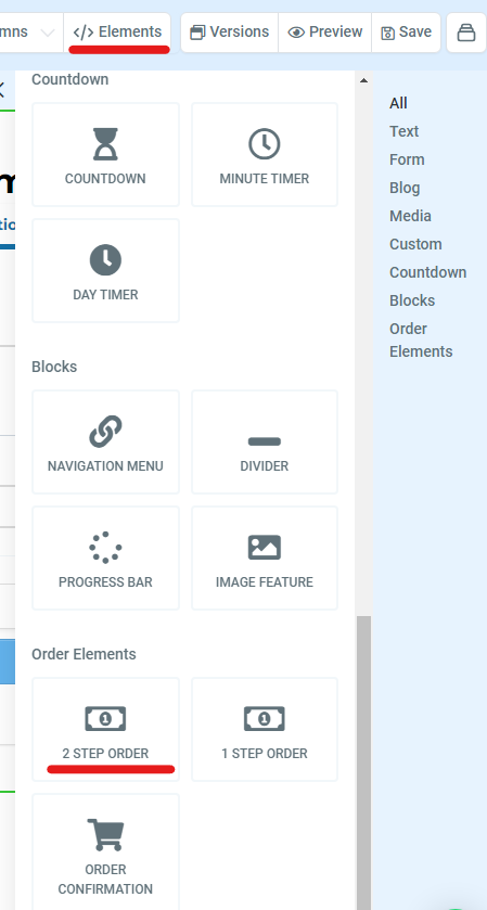 You can then customise this page as you wish however the most important aspect of this page is an order form element. To add an order form element click Elements > Add Element. Scroll down until you see your Order Elements at the very bottom. You have the option to add a 1 step or 2 step order element. A 1 step order element is where all information will be filled out in one step and a 2 step order form is where it will be filled out over two separate steps. You can choose either one however we do recommend choosing the 2 step order element as there are more features to utilise in these forms in automations