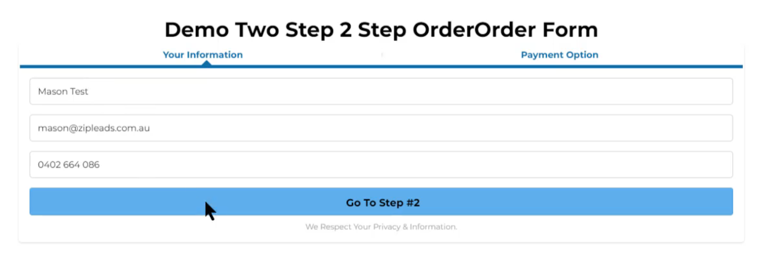 This will then take you to the order page where your information will be pre filled out. This is due to the sticky contact form being toggled on in your opt-in form you created. Select ‘Go To Step #2’
