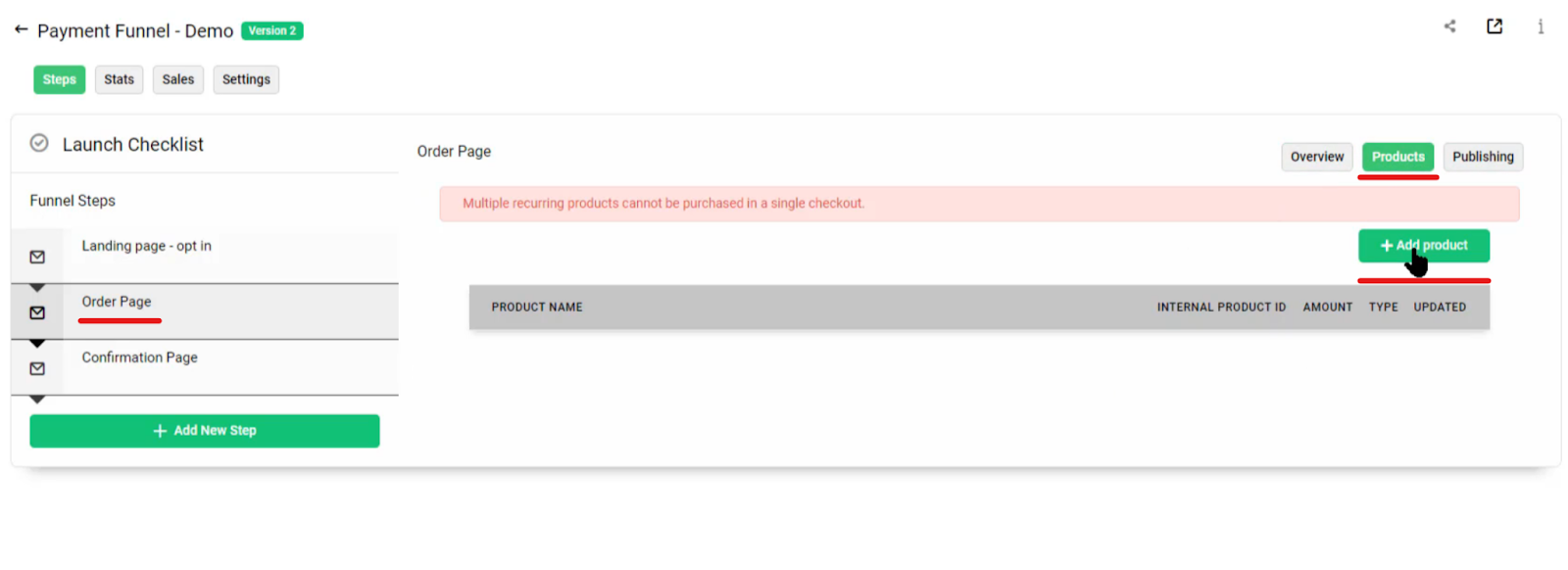 In order for your funnel to work, you will need to have a product set up in your account that you will add to this payment funnel. If you haven’t yet done this, watch our Adding Products video to learn how you can do this. You will also need to have Stripe integrated within your account. You can watch our Integrating Stripe video to learn how you can do this.