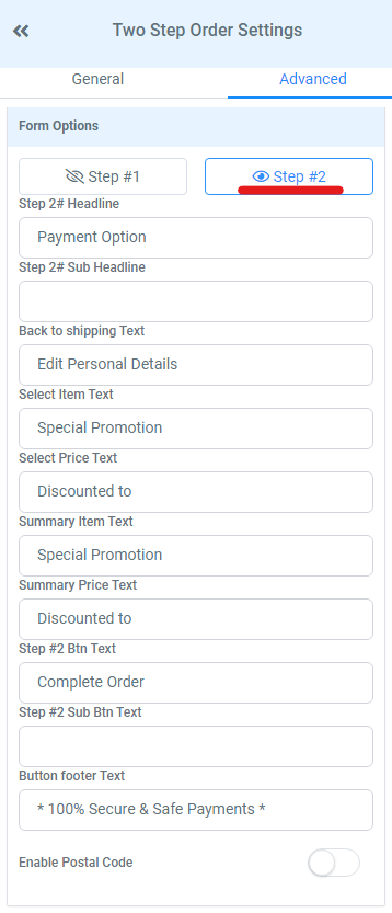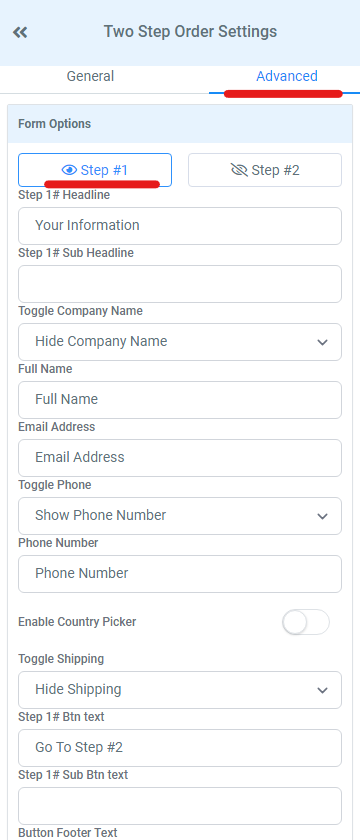 Click through to the ‘Advanced’ tab. Here is where you can hide or update certain text within the form. Firstly, you can edit step #1. You have the option to edit the headline and sub headline text of the first step. You also have the option to hide certain steps like company name and shipping address if you don’t require those fields to be filled out so you are just left with the required fields on the form